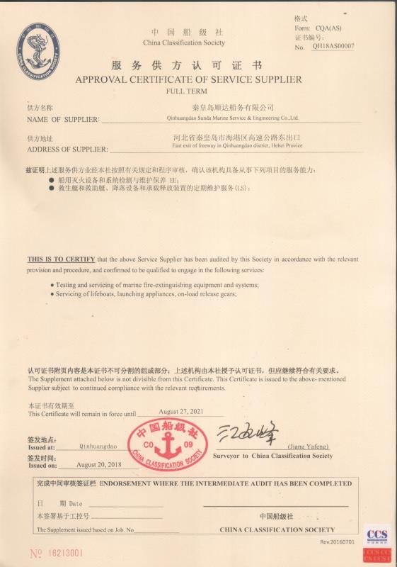 秦皇島順達船務有限公司位于美麗的海濱城市、中國北方著名的能源輸出大港--秦皇島。公司從事于船舶修理、物料供應、水下檢測、船體測厚、消防救生設備及救生艇檢驗、電氣自動化修理等服務。 公司自1997年成立至今,先后為國內外船東修理、檢驗各類船舶萬余艘,積累了豐富的施工經驗。公司現有場地100余畝,員工30余人,以及工程用車若干臺。我們公司一直本著嚴以律己、真誠待人、精益求精、信譽至上的經營理念,以優質的服務、專業的施工、合理的收費,得到了國內外船東的廣泛認可,贏得了良好的口碑和信譽。 公司已取得了中國船級社(CCS)、美國船級社(ABS)、日本船級社(NK)、德國船級社(DNV GL)等各個船級社的消防救生和救生艇檢驗資質, ...